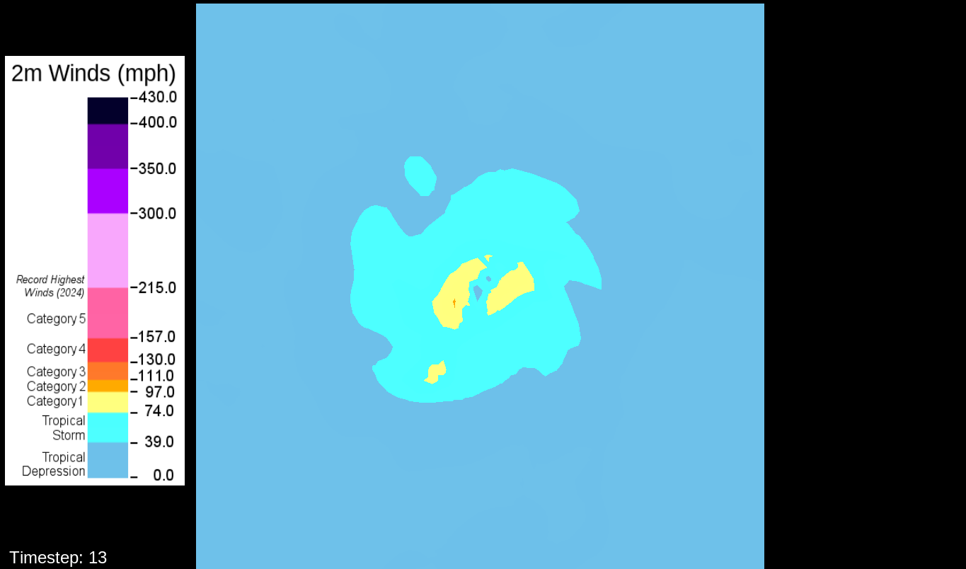 That it would be the PBL scheme makes sense, because this only happens for the U10 and V10 winds. For the U and V winds at all model levels, the winds are perfectly reasonable for increasingly deepening pressures, including in the sub-800 hPa range, and even into the theorized hypercane pressure range (sub-700 hPa). For these images, I have therefore used the level-0 (out of 30) U and V winds to calculate surface wind speeds.
