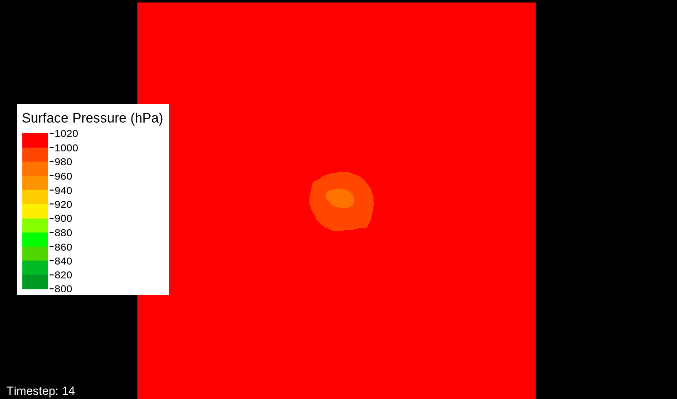 That it would be the PBL scheme makes sense, because this only happens for the U10 and V10 winds. For the U and V winds at all model levels, the winds are perfectly reasonable for increasingly deepening pressures, including in the sub-800 hPa range, and even into the theorized hypercane pressure range (sub-700 hPa). For these images, I have therefore used the level-0 (out of 30) U and V winds to calculate surface wind speeds.