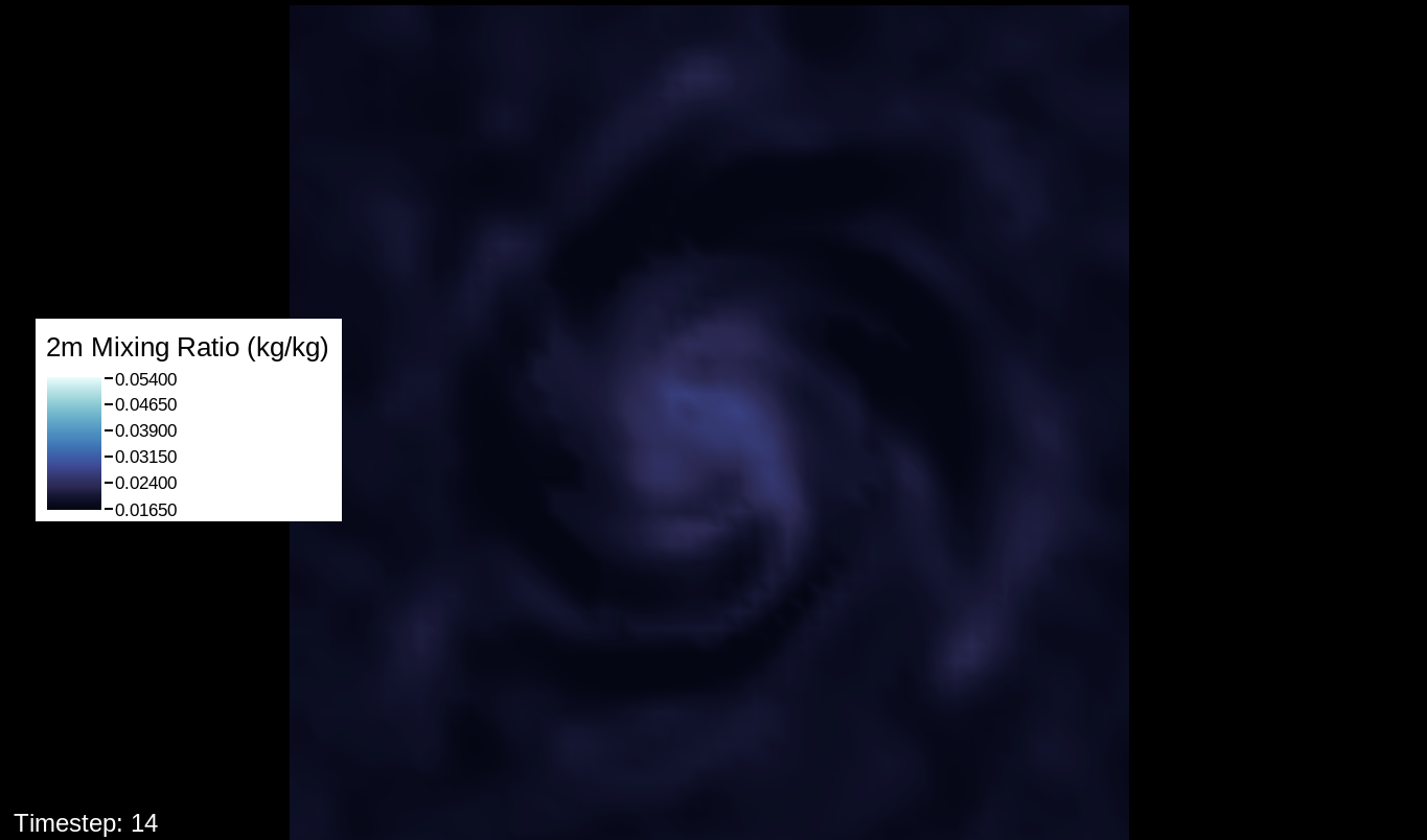 A note about the surface wind images, mostly for WRF experts and those who want to simulate the storm themselves: The images in this viewer do not represent the speed computation of the U10 and V10 speeds (the square root of the product of each of these added together). The reason for this is that the WRF’s surface wind computation is questionable for high-intensity storms. I’ve used an alternate computation that I think is more realistic for this type of system.