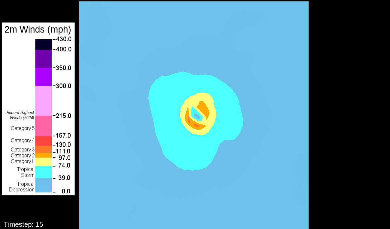 That it would be the PBL scheme makes sense, because this only happens for the U10 and V10 winds. For the U and V winds at all model levels, the winds are perfectly reasonable for increasingly deepening pressures, including in the sub-800 hPa range, and even into the theorized hypercane pressure range (sub-700 hPa). For these images, I have therefore used the level-0 (out of 30) U and V winds to calculate surface wind speeds.