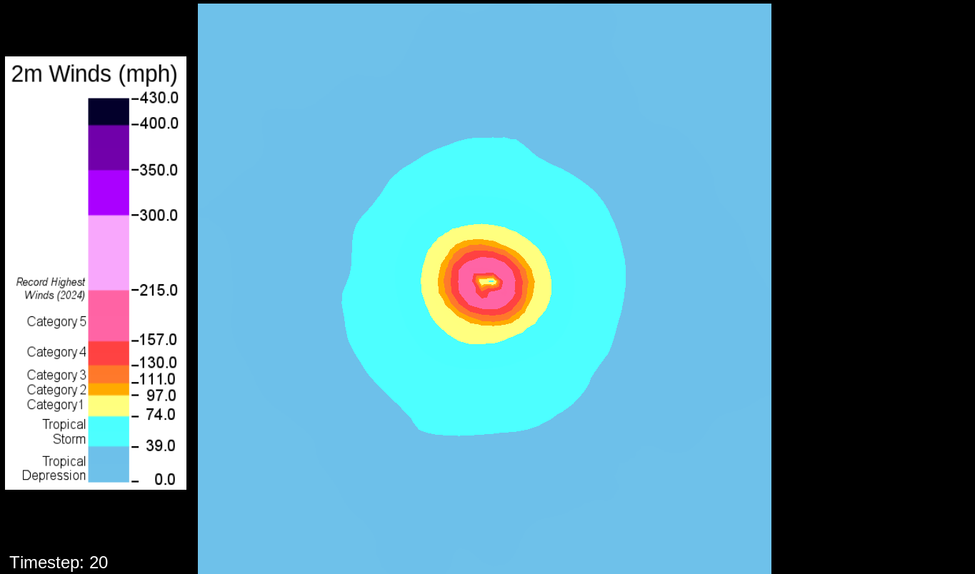 That it would be the PBL scheme makes sense, because this only happens for the U10 and V10 winds. For the U and V winds at all model levels, the winds are perfectly reasonable for increasingly deepening pressures, including in the sub-800 hPa range, and even into the theorized hypercane pressure range (sub-700 hPa). For these images, I have therefore used the level-0 (out of 30) U and V winds to calculate surface wind speeds.