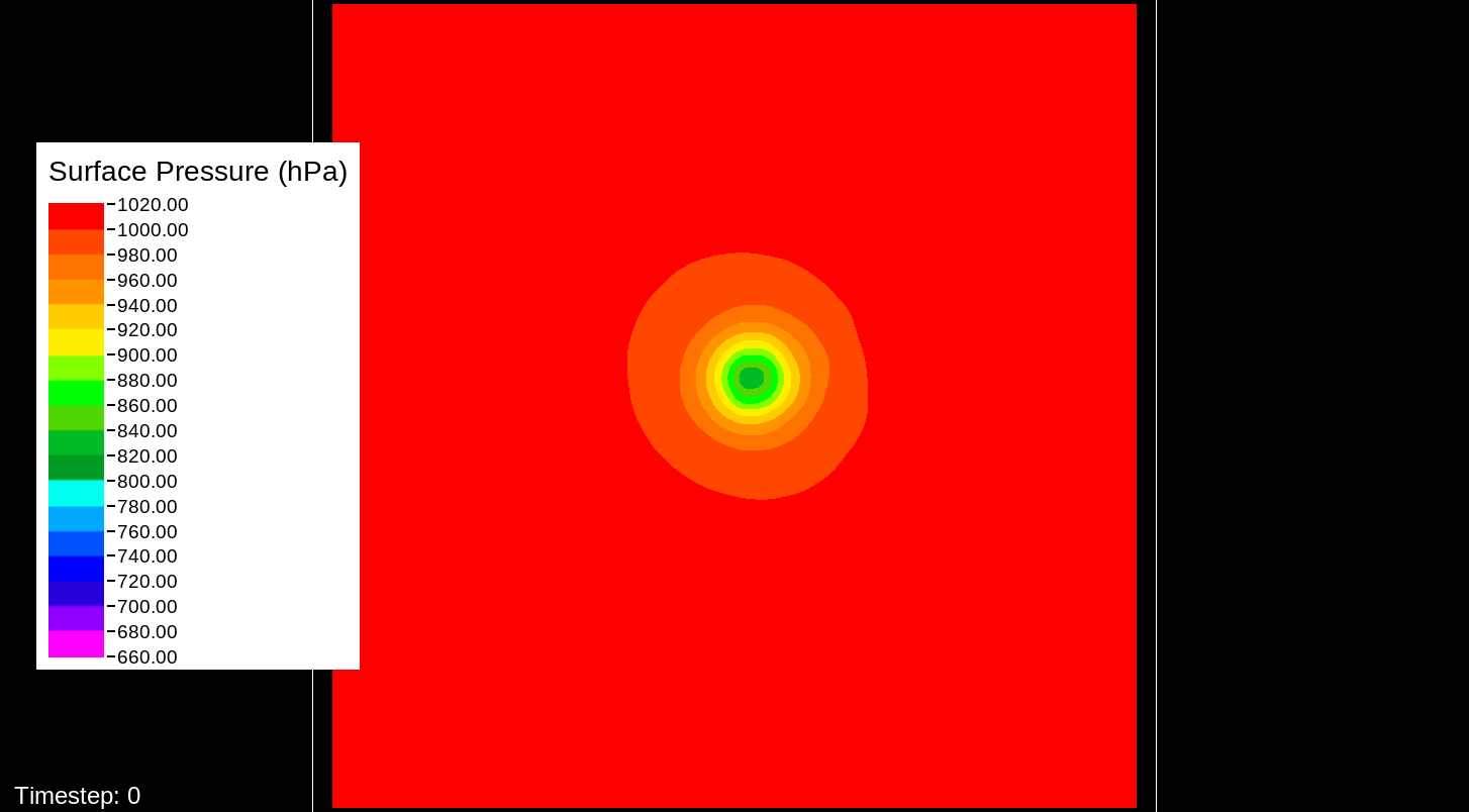 That it would be the PBL scheme makes sense, because this only happens for the U10 and V10 winds. For the U and V winds at all model levels, the winds are perfectly reasonable for increasingly deepening pressures, including in the sub-800 hPa range, and even into the theorized hypercane pressure range (sub-700 hPa). For these images, I have therefore used the level-0 (out of 30) U and V winds to calculate surface wind speeds.