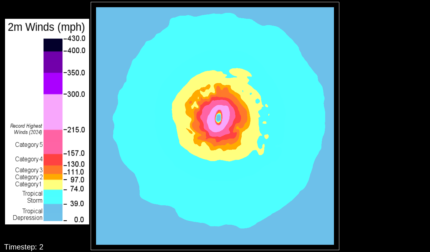 That it would be the PBL scheme makes sense, because this only happens for the U10 and V10 winds. For the U and V winds at all model levels, the winds are perfectly reasonable for increasingly deepening pressures, including in the sub-800 hPa range, and even into the theorized hypercane pressure range (sub-700 hPa). For these images, I have therefore used the level-0 (out of 30) U and V winds to calculate surface wind speeds.