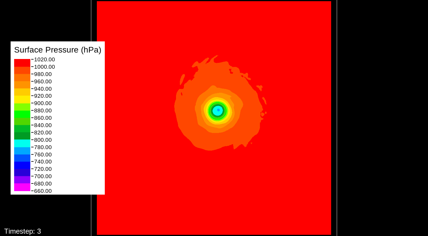 That it would be the PBL scheme makes sense, because this only happens for the U10 and V10 winds. For the U and V winds at all model levels, the winds are perfectly reasonable for increasingly deepening pressures, including in the sub-800 hPa range, and even into the theorized hypercane pressure range (sub-700 hPa). For these images, I have therefore used the level-0 (out of 30) U and V winds to calculate surface wind speeds.