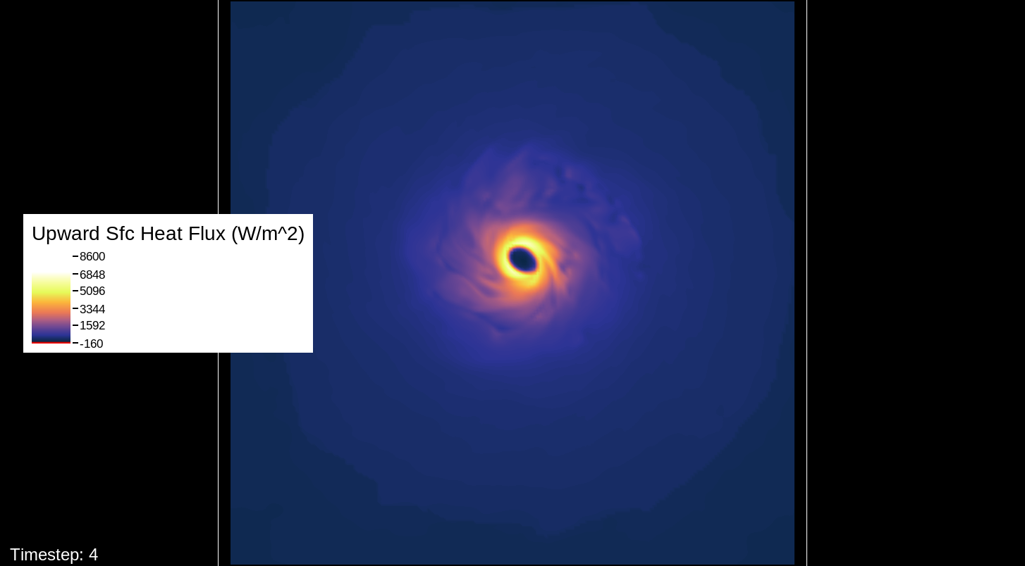 I know it isn’t a perfect solution, but there is only one defensible alternative I can see, and that is to turn off the PBL scheme for the storm simulation. I’m uncomfortable doing that, because it does need it to model its processes well at lower intensities. But I am using the assumption—supported by research, modeling, and observational data of intense hurricanes—that in such storms, planetary boundary layer mixing does not occur on a scale large enough to drive the wind speed down by more than a few knots. In the past, Hurricane Hunters typically used a 90% reduction factor for estimated surface winds (they would estimate surface winds at 90% of the speed of their measured flight-level winds). However, since they have been directly obtaining surface data from the stepped-frequency microwave radiometer, they’ve found that this 90% ratio does not always hold. Sometimes the surface winds are stronger than the flight-level winds. Sometimes they’re about the same. Sometimes they are weaker, but not 10% weaker. What hurricane researchers have found is that this ratio depends more on the processes of the storm itself than anything occurring in the planetary boundary layer. Therefore I claim this justification for declaring that, in my fictional hypercane, flight-level wind speeds (U,V level 0) are surface wind speeds.