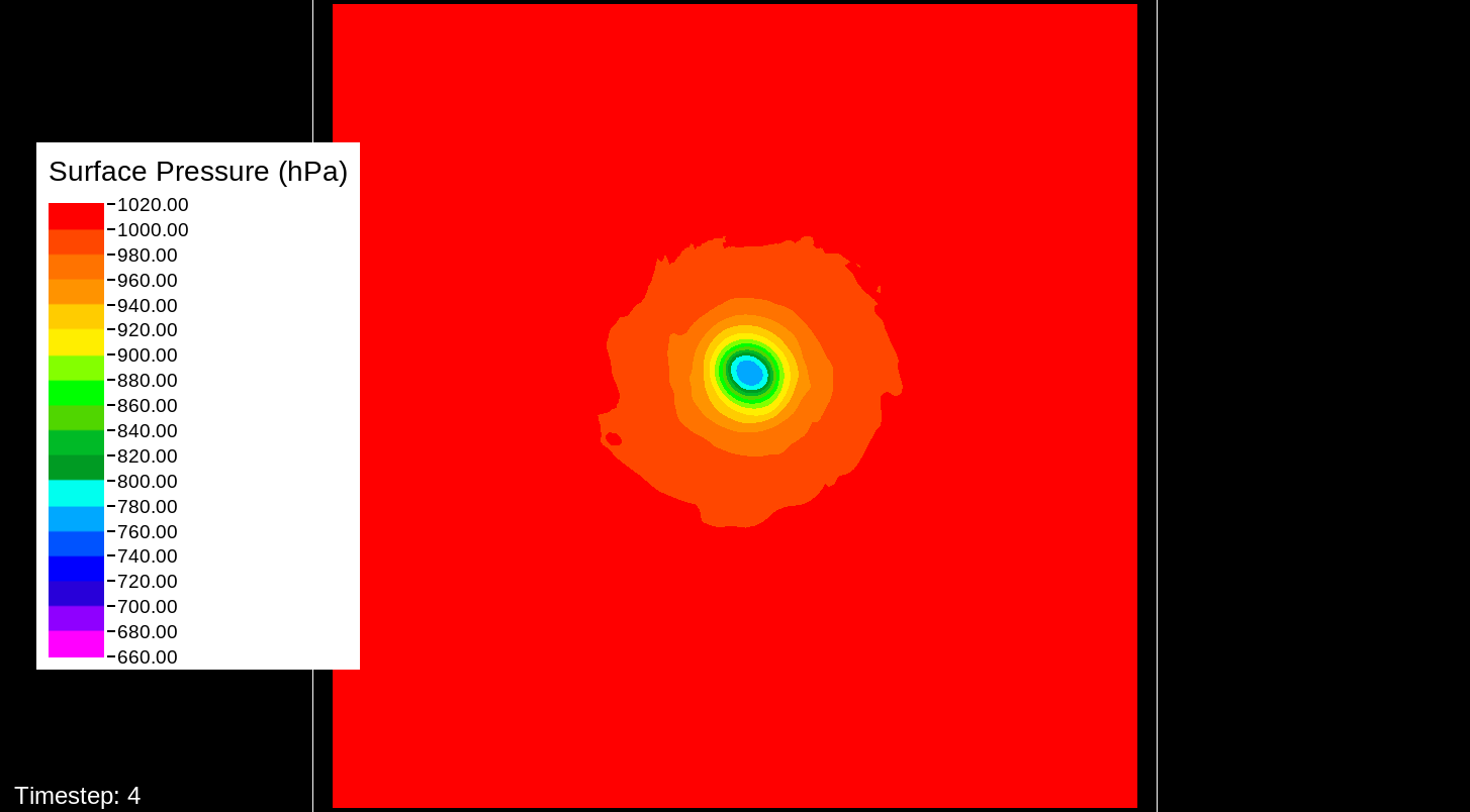 That it would be the PBL scheme makes sense, because this only happens for the U10 and V10 winds. For the U and V winds at all model levels, the winds are perfectly reasonable for increasingly deepening pressures, including in the sub-800 hPa range, and even into the theorized hypercane pressure range (sub-700 hPa). For these images, I have therefore used the level-0 (out of 30) U and V winds to calculate surface wind speeds.