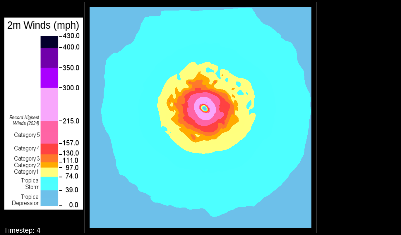 That it would be the PBL scheme makes sense, because this only happens for the U10 and V10 winds. For the U and V winds at all model levels, the winds are perfectly reasonable for increasingly deepening pressures, including in the sub-800 hPa range, and even into the theorized hypercane pressure range (sub-700 hPa). For these images, I have therefore used the level-0 (out of 30) U and V winds to calculate surface wind speeds.