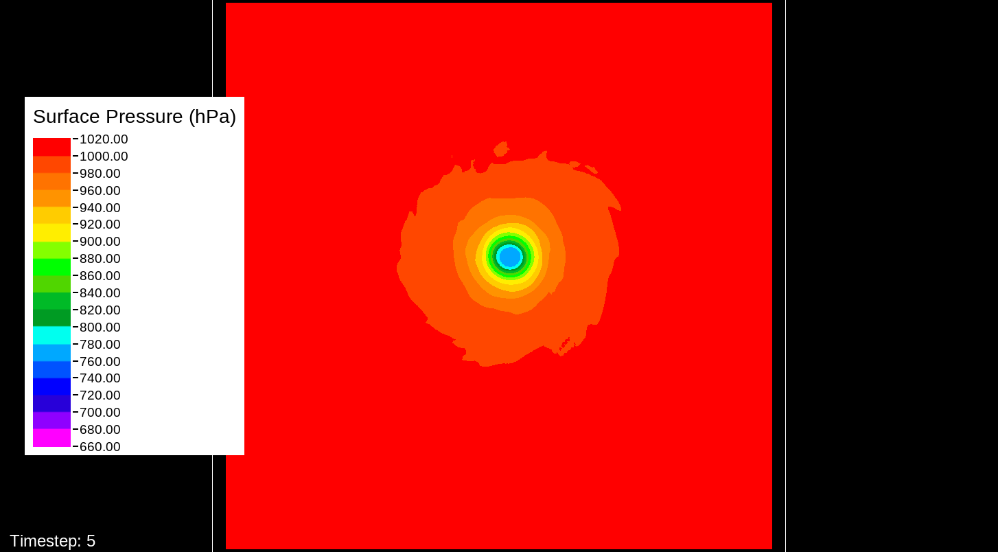 That it would be the PBL scheme makes sense, because this only happens for the U10 and V10 winds. For the U and V winds at all model levels, the winds are perfectly reasonable for increasingly deepening pressures, including in the sub-800 hPa range, and even into the theorized hypercane pressure range (sub-700 hPa). For these images, I have therefore used the level-0 (out of 30) U and V winds to calculate surface wind speeds.