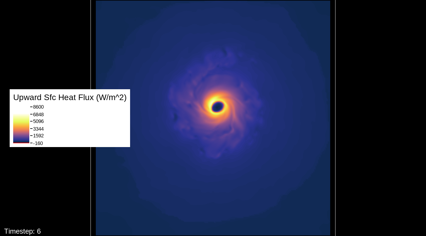 A note about the surface wind images, mostly for WRF experts and those who want to simulate the storm themselves: The images in this viewer do not represent the speed computation of the U10 and V10 speeds (the square root of the product of each of these added together). The reason for this is that the WRF’s surface wind computation is questionable for high-intensity storms. I’ve used an alternate computation that I think is more realistic for this type of system.