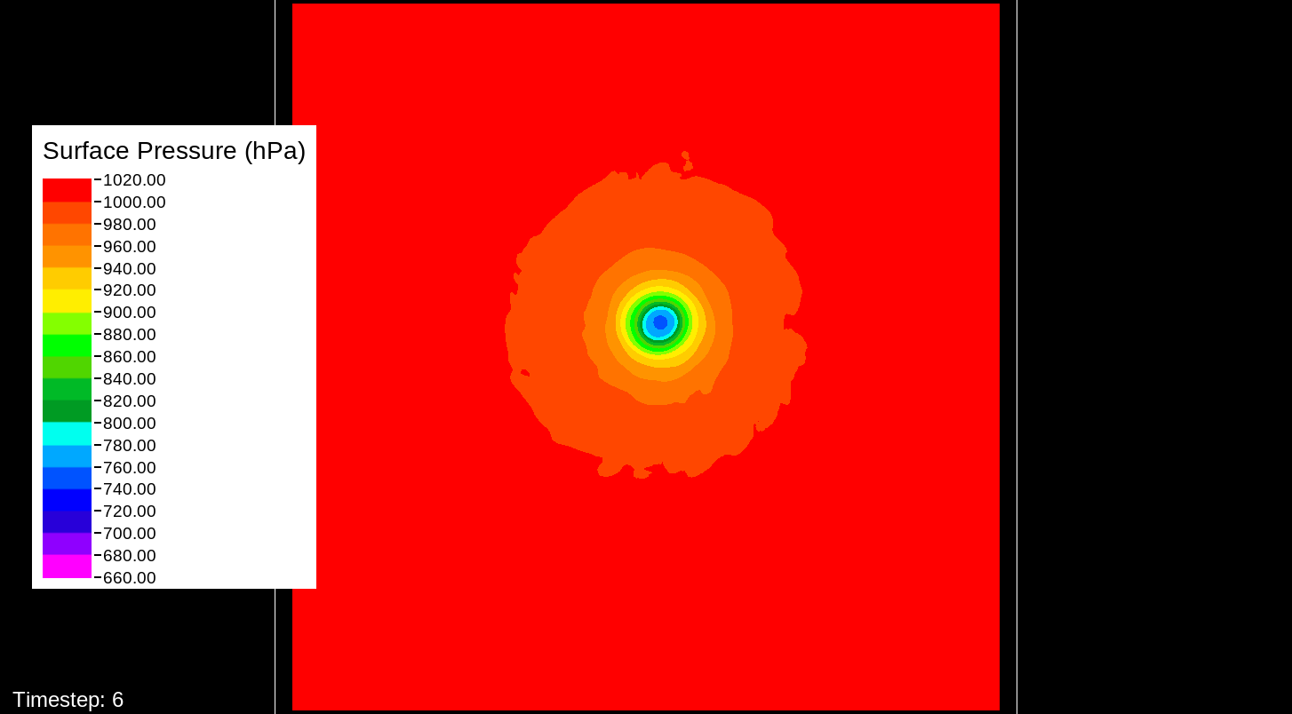That it would be the PBL scheme makes sense, because this only happens for the U10 and V10 winds. For the U and V winds at all model levels, the winds are perfectly reasonable for increasingly deepening pressures, including in the sub-800 hPa range, and even into the theorized hypercane pressure range (sub-700 hPa). For these images, I have therefore used the level-0 (out of 30) U and V winds to calculate surface wind speeds.