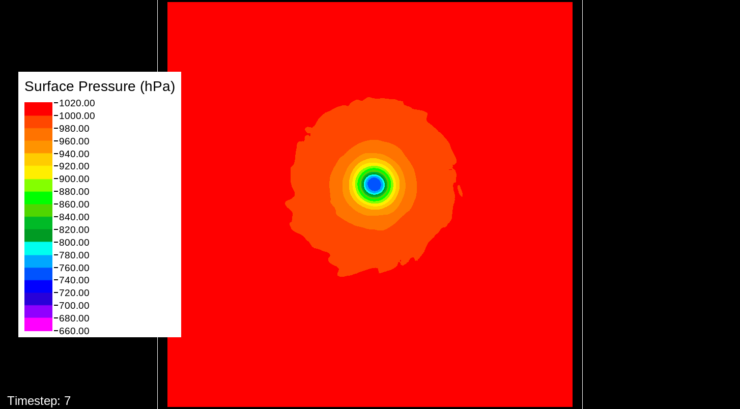 That it would be the PBL scheme makes sense, because this only happens for the U10 and V10 winds. For the U and V winds at all model levels, the winds are perfectly reasonable for increasingly deepening pressures, including in the sub-800 hPa range, and even into the theorized hypercane pressure range (sub-700 hPa). For these images, I have therefore used the level-0 (out of 30) U and V winds to calculate surface wind speeds.