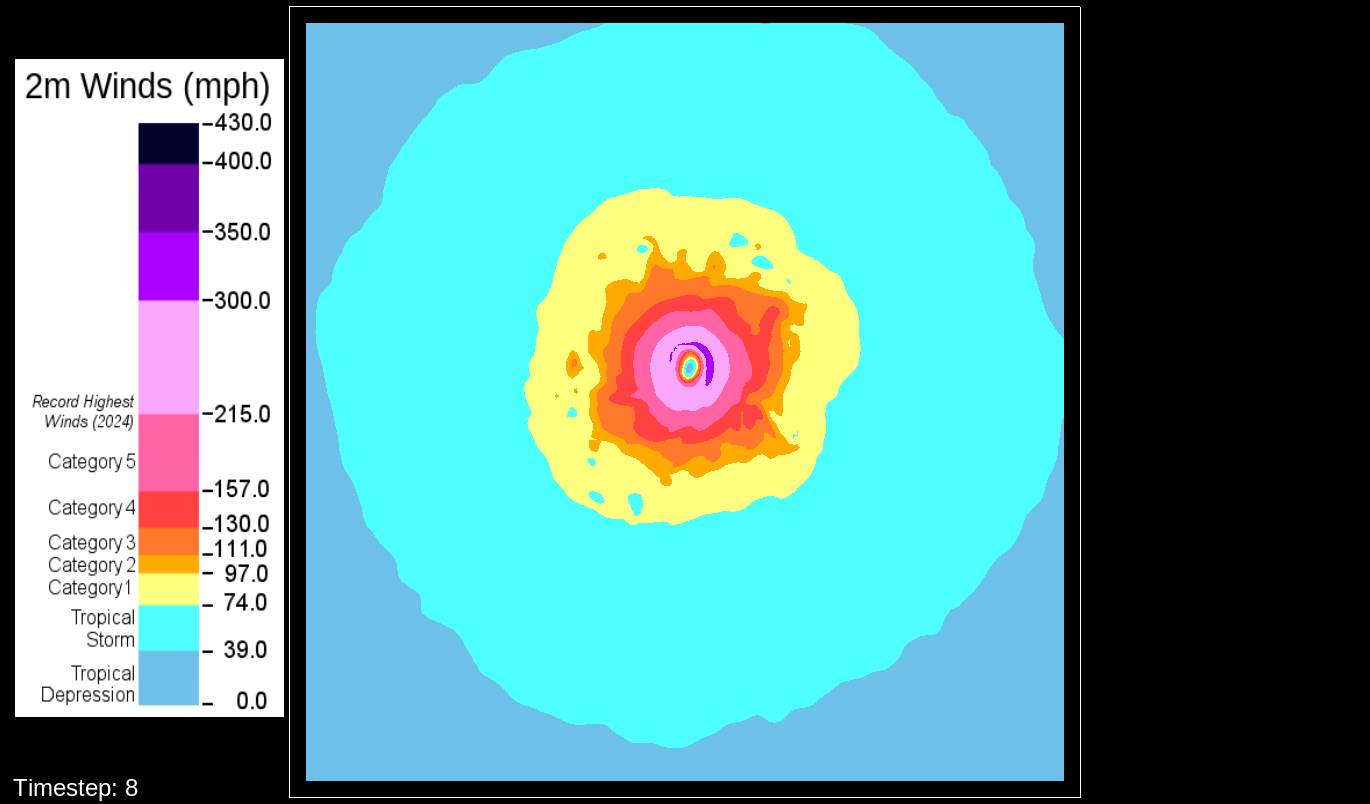 That it would be the PBL scheme makes sense, because this only happens for the U10 and V10 winds. For the U and V winds at all model levels, the winds are perfectly reasonable for increasingly deepening pressures, including in the sub-800 hPa range, and even into the theorized hypercane pressure range (sub-700 hPa). For these images, I have therefore used the level-0 (out of 30) U and V winds to calculate surface wind speeds.