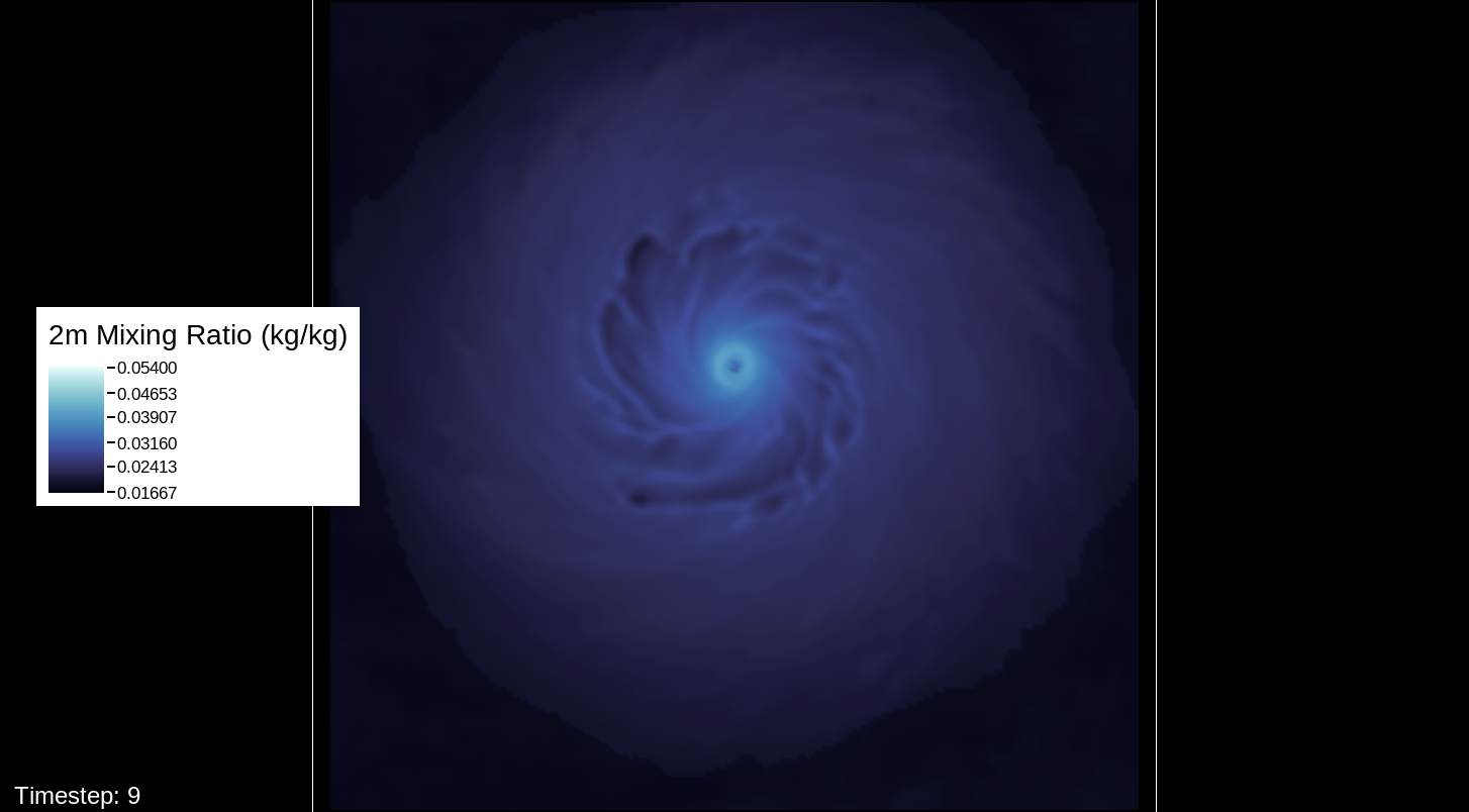 That it would be the PBL scheme makes sense, because this only happens for the U10 and V10 winds. For the U and V winds at all model levels, the winds are perfectly reasonable for increasingly deepening pressures, including in the sub-800 hPa range, and even into the theorized hypercane pressure range (sub-700 hPa). For these images, I have therefore used the level-0 (out of 30) U and V winds to calculate surface wind speeds.