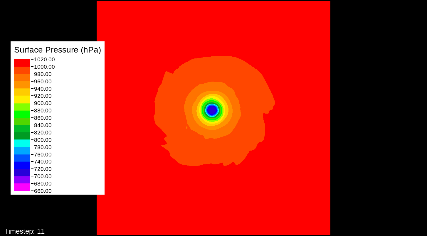 That it would be the PBL scheme makes sense, because this only happens for the U10 and V10 winds. For the U and V winds at all model levels, the winds are perfectly reasonable for increasingly deepening pressures, including in the sub-800 hPa range, and even into the theorized hypercane pressure range (sub-700 hPa). For these images, I have therefore used the level-0 (out of 30) U and V winds to calculate surface wind speeds.