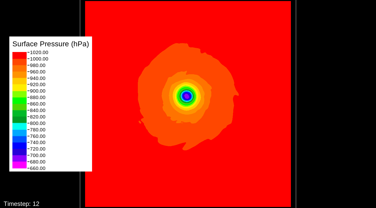 That it would be the PBL scheme makes sense, because this only happens for the U10 and V10 winds. For the U and V winds at all model levels, the winds are perfectly reasonable for increasingly deepening pressures, including in the sub-800 hPa range, and even into the theorized hypercane pressure range (sub-700 hPa). For these images, I have therefore used the level-0 (out of 30) U and V winds to calculate surface wind speeds.