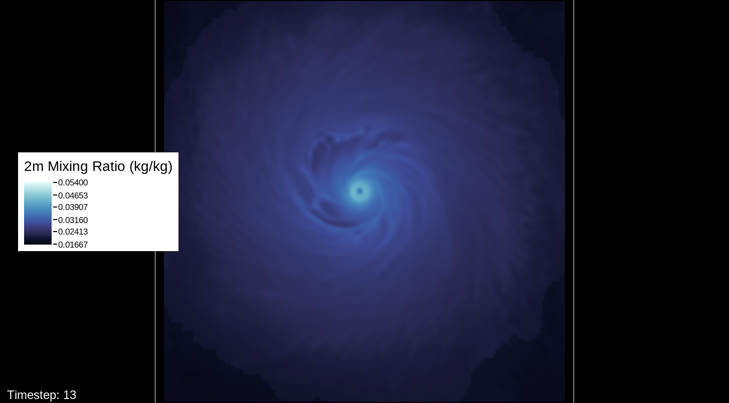 That it would be the PBL scheme makes sense, because this only happens for the U10 and V10 winds. For the U and V winds at all model levels, the winds are perfectly reasonable for increasingly deepening pressures, including in the sub-800 hPa range, and even into the theorized hypercane pressure range (sub-700 hPa). For these images, I have therefore used the level-0 (out of 30) U and V winds to calculate surface wind speeds.