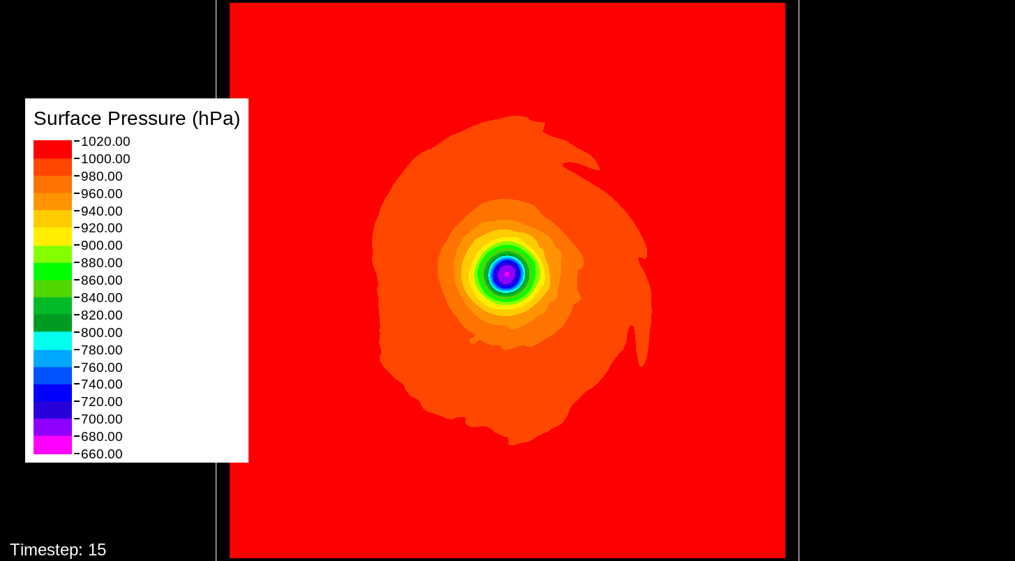 That it would be the PBL scheme makes sense, because this only happens for the U10 and V10 winds. For the U and V winds at all model levels, the winds are perfectly reasonable for increasingly deepening pressures, including in the sub-800 hPa range, and even into the theorized hypercane pressure range (sub-700 hPa). For these images, I have therefore used the level-0 (out of 30) U and V winds to calculate surface wind speeds.