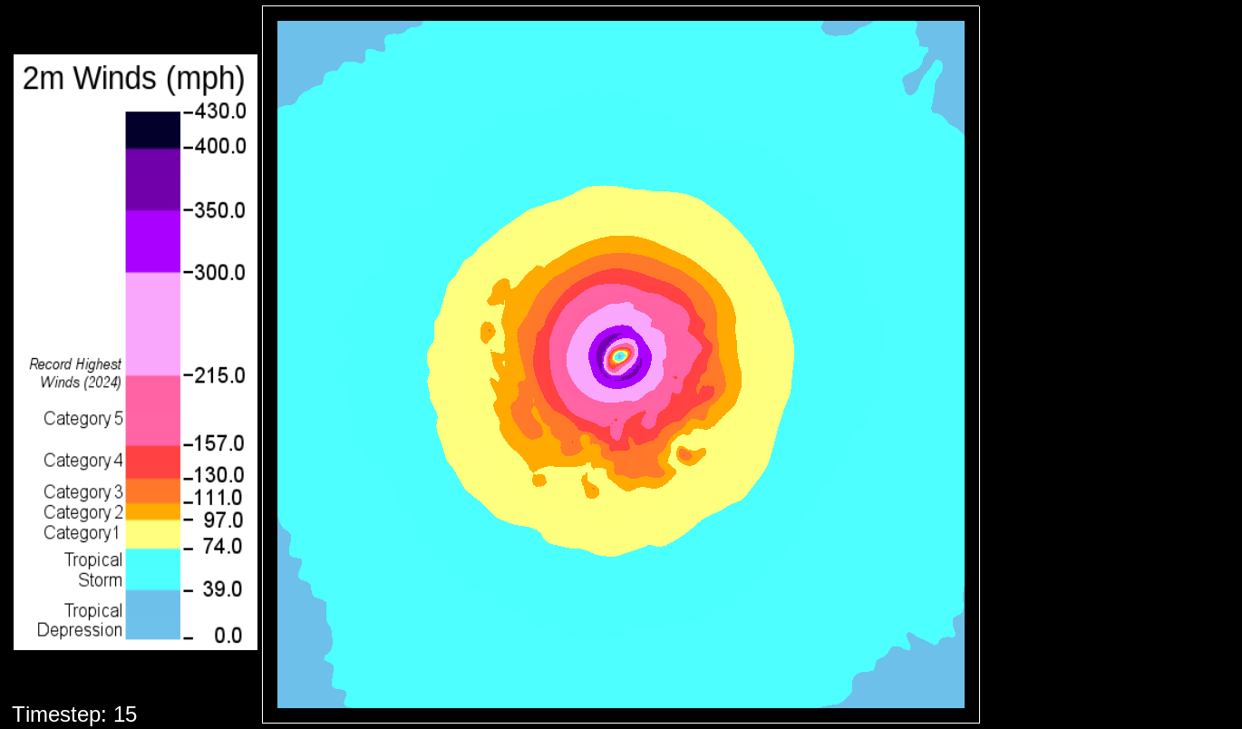 That it would be the PBL scheme makes sense, because this only happens for the U10 and V10 winds. For the U and V winds at all model levels, the winds are perfectly reasonable for increasingly deepening pressures, including in the sub-800 hPa range, and even into the theorized hypercane pressure range (sub-700 hPa). For these images, I have therefore used the level-0 (out of 30) U and V winds to calculate surface wind speeds.