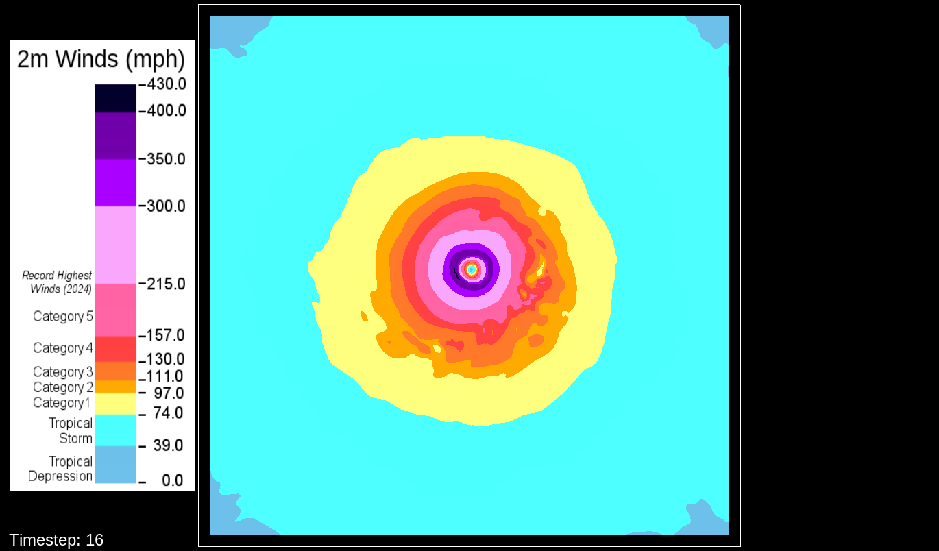 That it would be the PBL scheme makes sense, because this only happens for the U10 and V10 winds. For the U and V winds at all model levels, the winds are perfectly reasonable for increasingly deepening pressures, including in the sub-800 hPa range, and even into the theorized hypercane pressure range (sub-700 hPa). For these images, I have therefore used the level-0 (out of 30) U and V winds to calculate surface wind speeds.