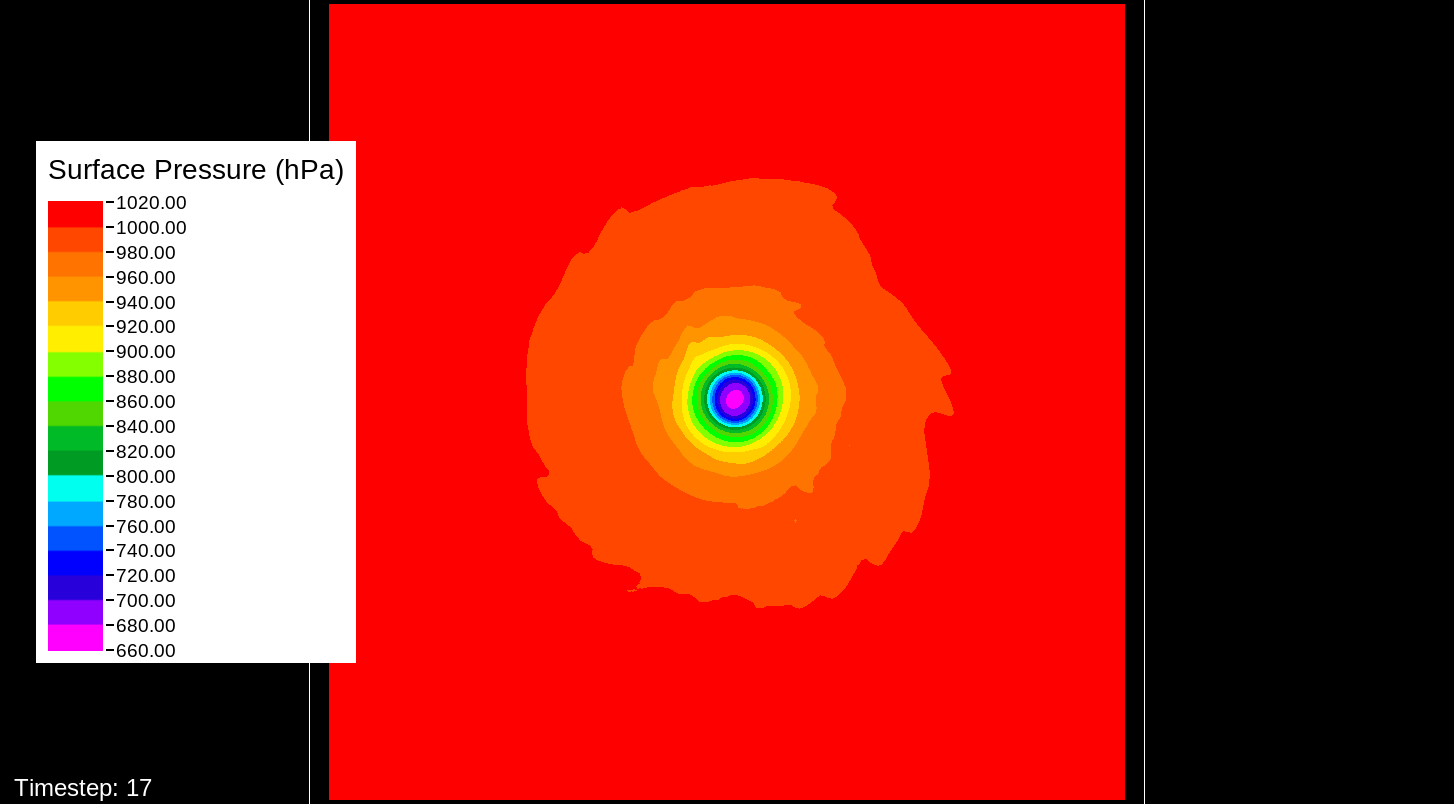 That it would be the PBL scheme makes sense, because this only happens for the U10 and V10 winds. For the U and V winds at all model levels, the winds are perfectly reasonable for increasingly deepening pressures, including in the sub-800 hPa range, and even into the theorized hypercane pressure range (sub-700 hPa). For these images, I have therefore used the level-0 (out of 30) U and V winds to calculate surface wind speeds.