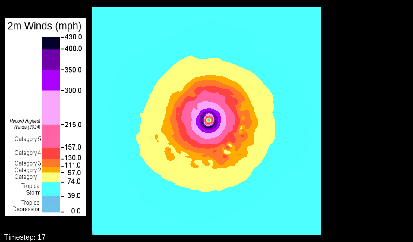 That it would be the PBL scheme makes sense, because this only happens for the U10 and V10 winds. For the U and V winds at all model levels, the winds are perfectly reasonable for increasingly deepening pressures, including in the sub-800 hPa range, and even into the theorized hypercane pressure range (sub-700 hPa). For these images, I have therefore used the level-0 (out of 30) U and V winds to calculate surface wind speeds.