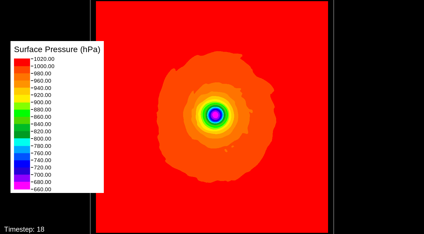 That it would be the PBL scheme makes sense, because this only happens for the U10 and V10 winds. For the U and V winds at all model levels, the winds are perfectly reasonable for increasingly deepening pressures, including in the sub-800 hPa range, and even into the theorized hypercane pressure range (sub-700 hPa). For these images, I have therefore used the level-0 (out of 30) U and V winds to calculate surface wind speeds.