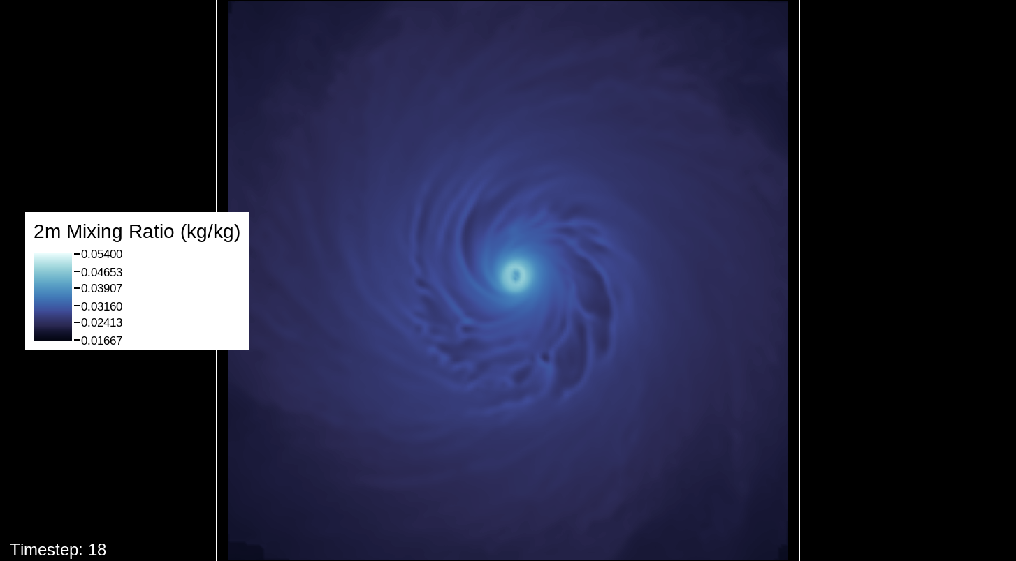 That it would be the PBL scheme makes sense, because this only happens for the U10 and V10 winds. For the U and V winds at all model levels, the winds are perfectly reasonable for increasingly deepening pressures, including in the sub-800 hPa range, and even into the theorized hypercane pressure range (sub-700 hPa). For these images, I have therefore used the level-0 (out of 30) U and V winds to calculate surface wind speeds.