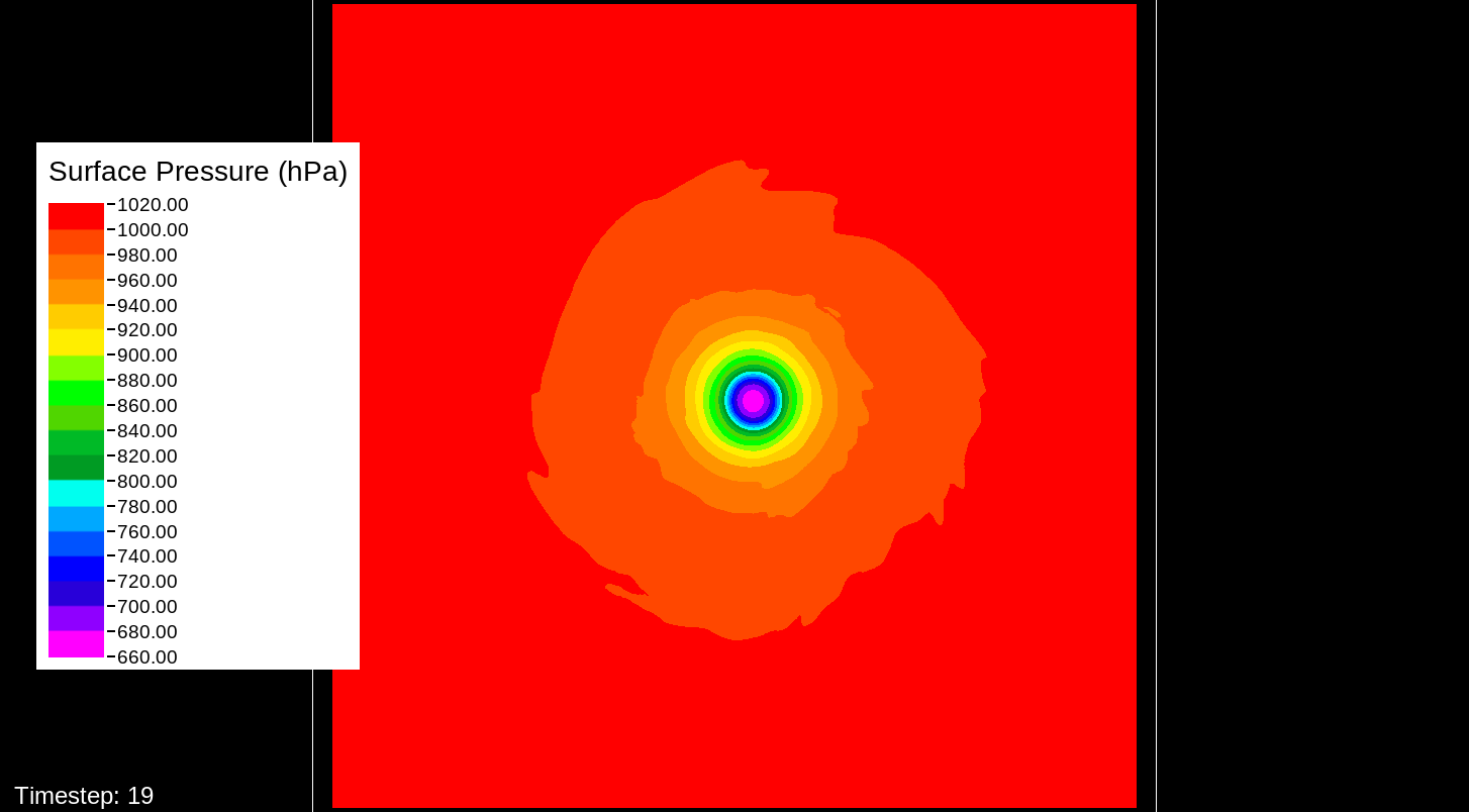 That it would be the PBL scheme makes sense, because this only happens for the U10 and V10 winds. For the U and V winds at all model levels, the winds are perfectly reasonable for increasingly deepening pressures, including in the sub-800 hPa range, and even into the theorized hypercane pressure range (sub-700 hPa). For these images, I have therefore used the level-0 (out of 30) U and V winds to calculate surface wind speeds.