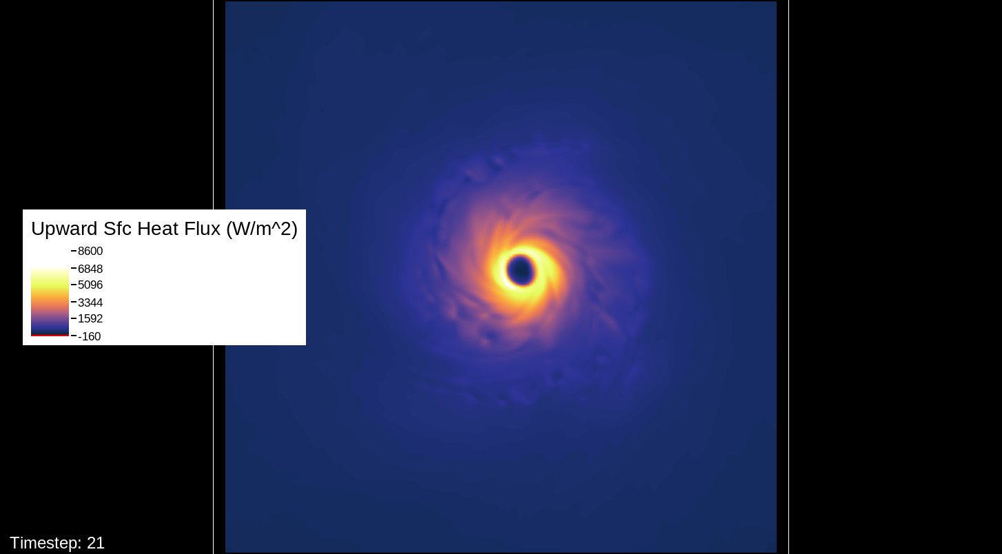 That it would be the PBL scheme makes sense, because this only happens for the U10 and V10 winds. For the U and V winds at all model levels, the winds are perfectly reasonable for increasingly deepening pressures, including in the sub-800 hPa range, and even into the theorized hypercane pressure range (sub-700 hPa). For these images, I have therefore used the level-0 (out of 30) U and V winds to calculate surface wind speeds.