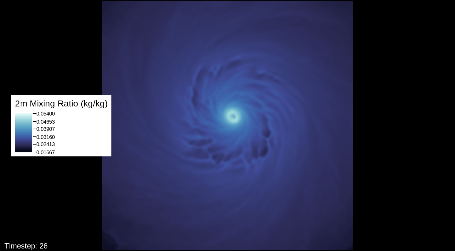 A note about the surface wind images, mostly for WRF experts and those who want to simulate the storm themselves: The images in this viewer do not represent the speed computation of the U10 and V10 speeds (the square root of the product of each of these added together). The reason for this is that the WRF’s surface wind computation is questionable for high-intensity storms. I’ve used an alternate computation that I think is more realistic for this type of system.