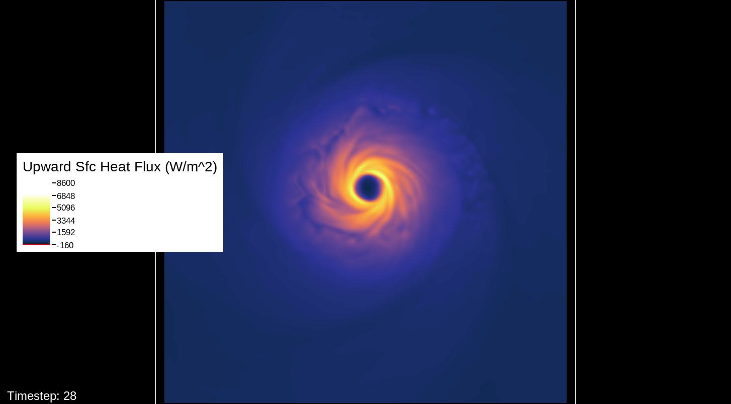 A note about the surface wind images, mostly for WRF experts and those who want to simulate the storm themselves: The images in this viewer do not represent the speed computation of the U10 and V10 speeds (the square root of the product of each of these added together). The reason for this is that the WRF’s surface wind computation is questionable for high-intensity storms. I’ve used an alternate computation that I think is more realistic for this type of system.