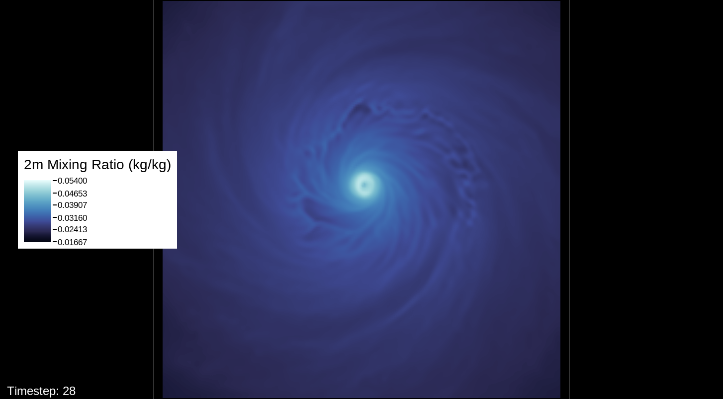 That it would be the PBL scheme makes sense, because this only happens for the U10 and V10 winds. For the U and V winds at all model levels, the winds are perfectly reasonable for increasingly deepening pressures, including in the sub-800 hPa range, and even into the theorized hypercane pressure range (sub-700 hPa). For these images, I have therefore used the level-0 (out of 30) U and V winds to calculate surface wind speeds.