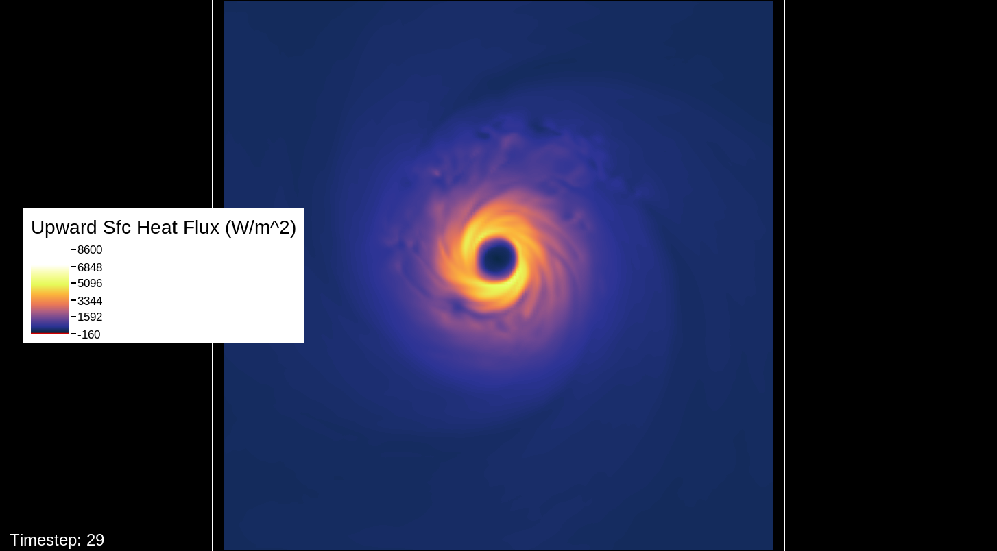 A note about the surface wind images, mostly for WRF experts and those who want to simulate the storm themselves: The images in this viewer do not represent the speed computation of the U10 and V10 speeds (the square root of the product of each of these added together). The reason for this is that the WRF’s surface wind computation is questionable for high-intensity storms. I’ve used an alternate computation that I think is more realistic for this type of system.
