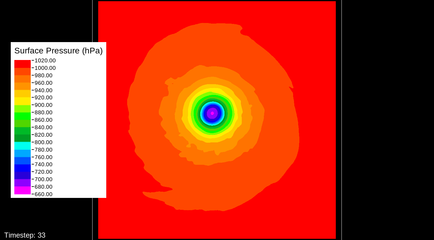 That it would be the PBL scheme makes sense, because this only happens for the U10 and V10 winds. For the U and V winds at all model levels, the winds are perfectly reasonable for increasingly deepening pressures, including in the sub-800 hPa range, and even into the theorized hypercane pressure range (sub-700 hPa). For these images, I have therefore used the level-0 (out of 30) U and V winds to calculate surface wind speeds.