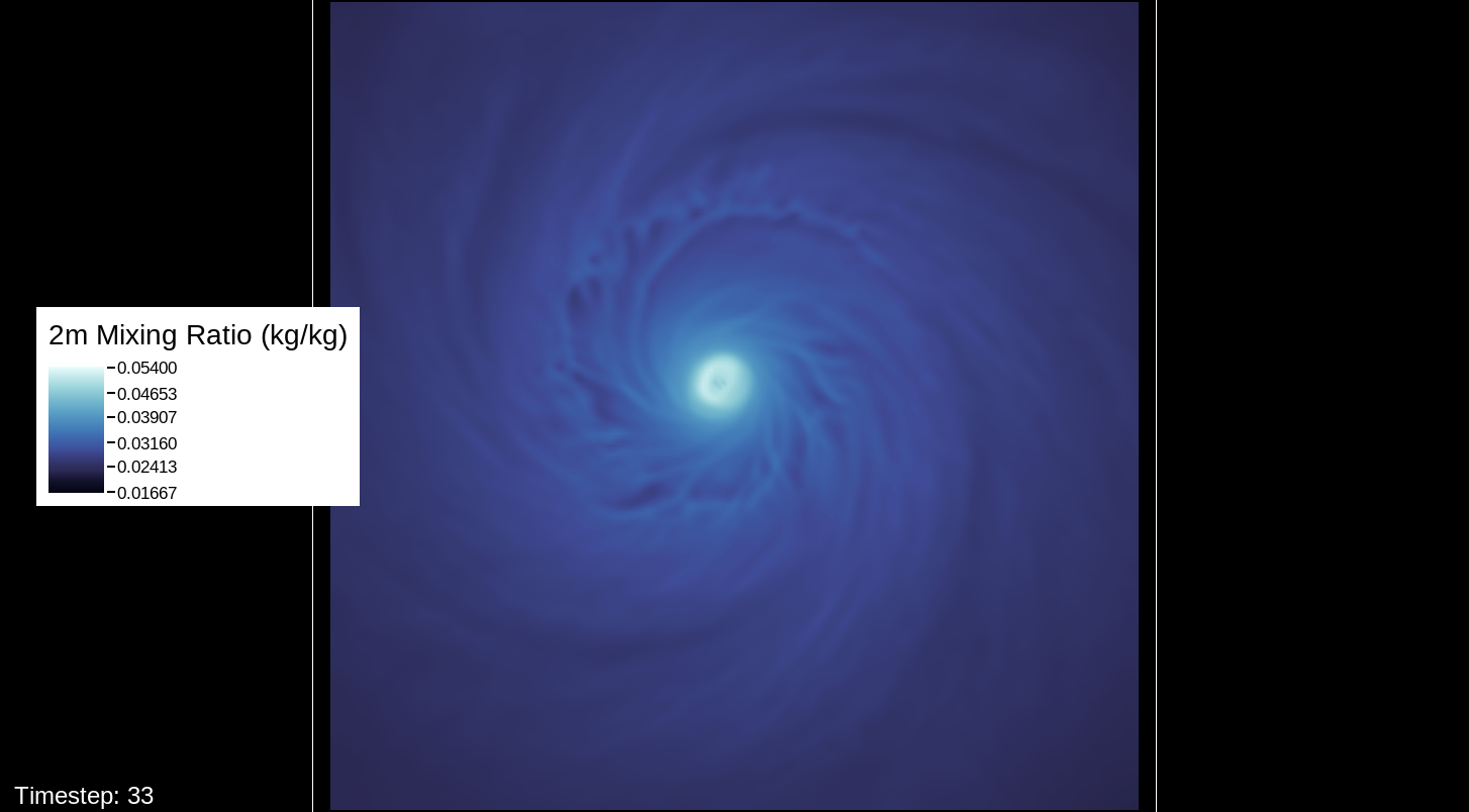 A note about the surface wind images, mostly for WRF experts and those who want to simulate the storm themselves: The images in this viewer do not represent the speed computation of the U10 and V10 speeds (the square root of the product of each of these added together). The reason for this is that the WRF’s surface wind computation is questionable for high-intensity storms. I’ve used an alternate computation that I think is more realistic for this type of system.