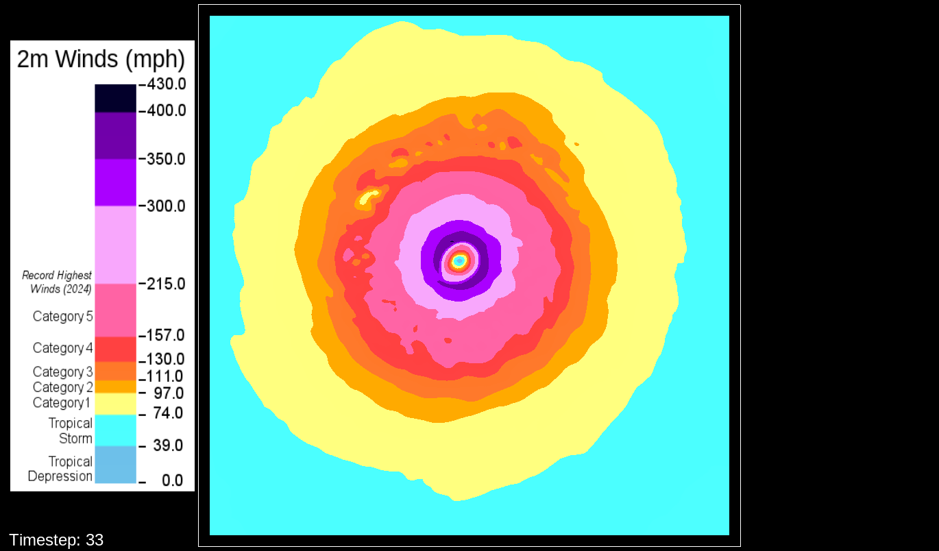 That it would be the PBL scheme makes sense, because this only happens for the U10 and V10 winds. For the U and V winds at all model levels, the winds are perfectly reasonable for increasingly deepening pressures, including in the sub-800 hPa range, and even into the theorized hypercane pressure range (sub-700 hPa). For these images, I have therefore used the level-0 (out of 30) U and V winds to calculate surface wind speeds.