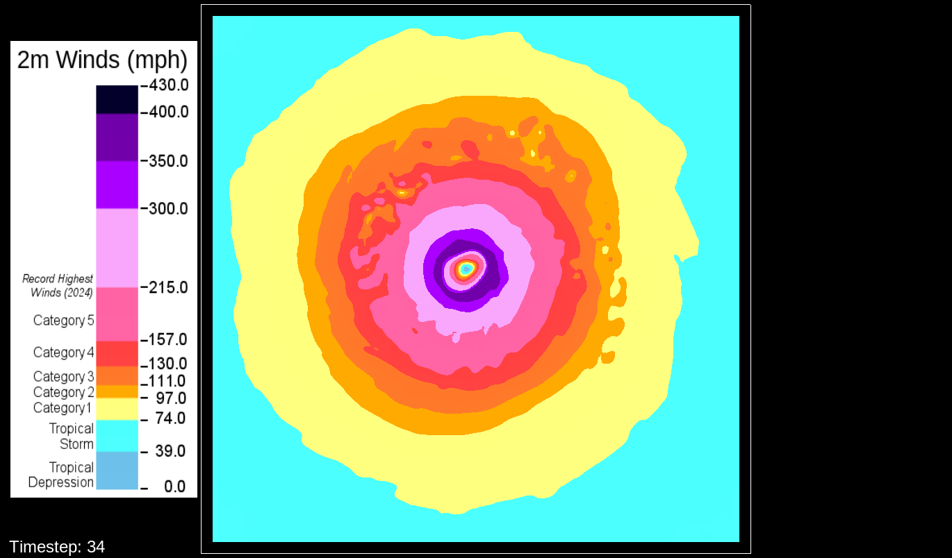 That it would be the PBL scheme makes sense, because this only happens for the U10 and V10 winds. For the U and V winds at all model levels, the winds are perfectly reasonable for increasingly deepening pressures, including in the sub-800 hPa range, and even into the theorized hypercane pressure range (sub-700 hPa). For these images, I have therefore used the level-0 (out of 30) U and V winds to calculate surface wind speeds.