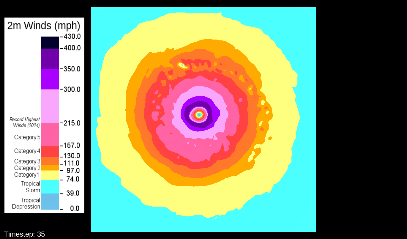 That it would be the PBL scheme makes sense, because this only happens for the U10 and V10 winds. For the U and V winds at all model levels, the winds are perfectly reasonable for increasingly deepening pressures, including in the sub-800 hPa range, and even into the theorized hypercane pressure range (sub-700 hPa). For these images, I have therefore used the level-0 (out of 30) U and V winds to calculate surface wind speeds.
