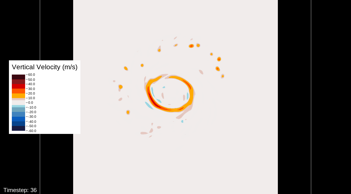 That it would be the PBL scheme makes sense, because this only happens for the U10 and V10 winds. For the U and V winds at all model levels, the winds are perfectly reasonable for increasingly deepening pressures, including in the sub-800 hPa range, and even into the theorized hypercane pressure range (sub-700 hPa). For these images, I have therefore used the level-0 (out of 30) U and V winds to calculate surface wind speeds.
