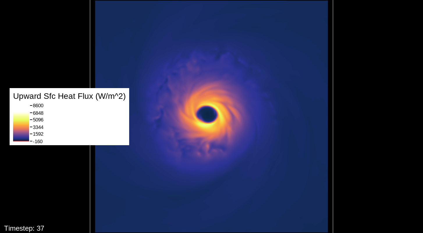 That it would be the PBL scheme makes sense, because this only happens for the U10 and V10 winds. For the U and V winds at all model levels, the winds are perfectly reasonable for increasingly deepening pressures, including in the sub-800 hPa range, and even into the theorized hypercane pressure range (sub-700 hPa). For these images, I have therefore used the level-0 (out of 30) U and V winds to calculate surface wind speeds.