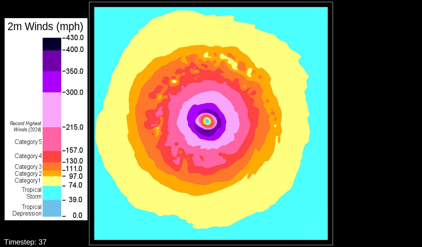 That it would be the PBL scheme makes sense, because this only happens for the U10 and V10 winds. For the U and V winds at all model levels, the winds are perfectly reasonable for increasingly deepening pressures, including in the sub-800 hPa range, and even into the theorized hypercane pressure range (sub-700 hPa). For these images, I have therefore used the level-0 (out of 30) U and V winds to calculate surface wind speeds.