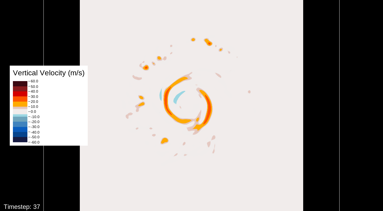 That it would be the PBL scheme makes sense, because this only happens for the U10 and V10 winds. For the U and V winds at all model levels, the winds are perfectly reasonable for increasingly deepening pressures, including in the sub-800 hPa range, and even into the theorized hypercane pressure range (sub-700 hPa). For these images, I have therefore used the level-0 (out of 30) U and V winds to calculate surface wind speeds.