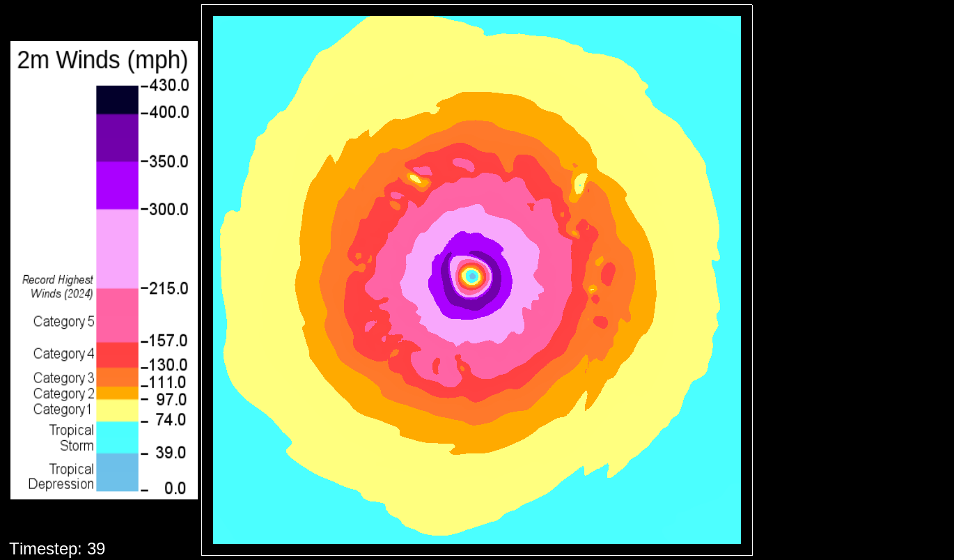 That it would be the PBL scheme makes sense, because this only happens for the U10 and V10 winds. For the U and V winds at all model levels, the winds are perfectly reasonable for increasingly deepening pressures, including in the sub-800 hPa range, and even into the theorized hypercane pressure range (sub-700 hPa). For these images, I have therefore used the level-0 (out of 30) U and V winds to calculate surface wind speeds.
