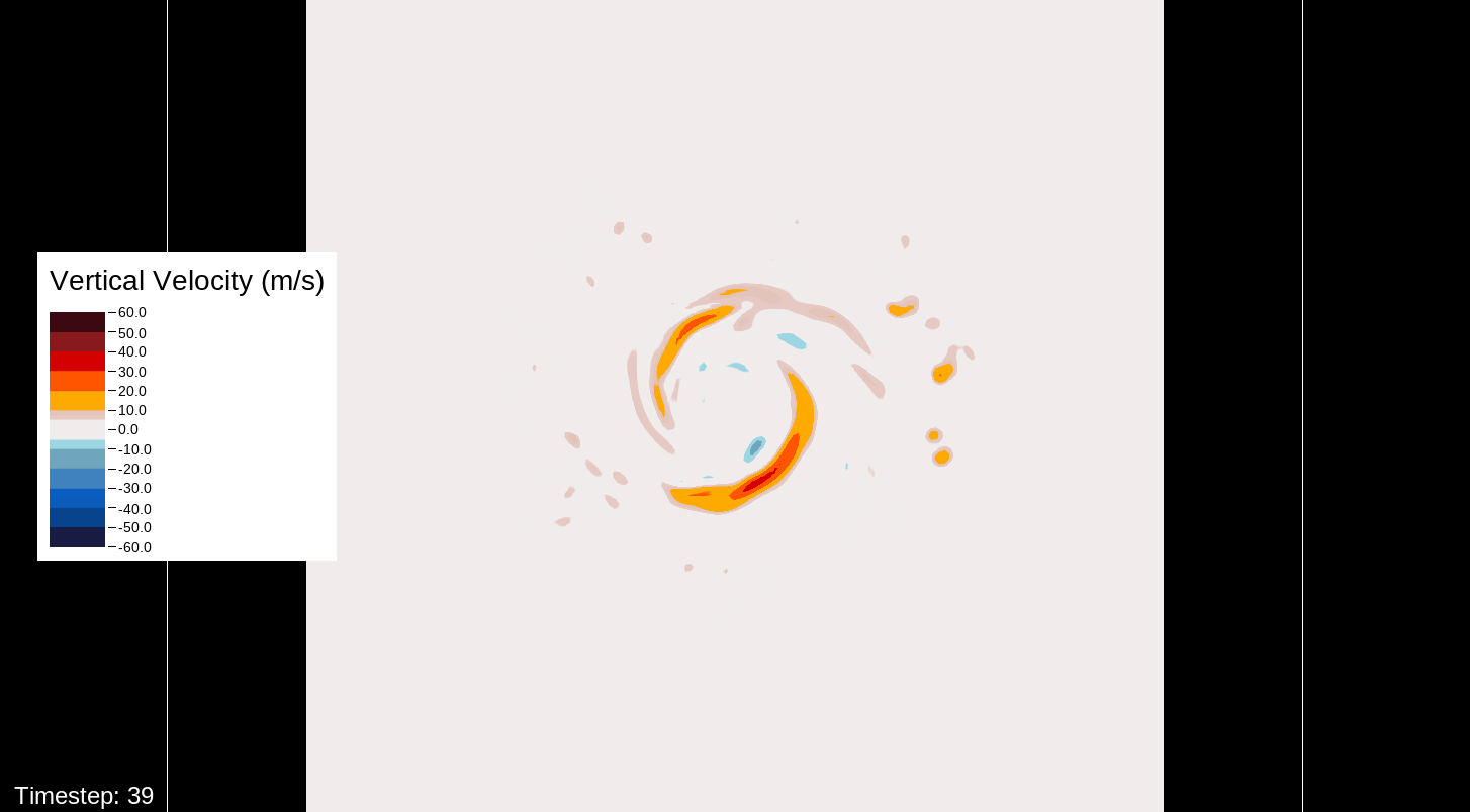 A note about the surface wind images, mostly for WRF experts and those who want to simulate the storm themselves: The images in this viewer do not represent the speed computation of the U10 and V10 speeds (the square root of the product of each of these added together). The reason for this is that the WRF’s surface wind computation is questionable for high-intensity storms. I’ve used an alternate computation that I think is more realistic for this type of system.