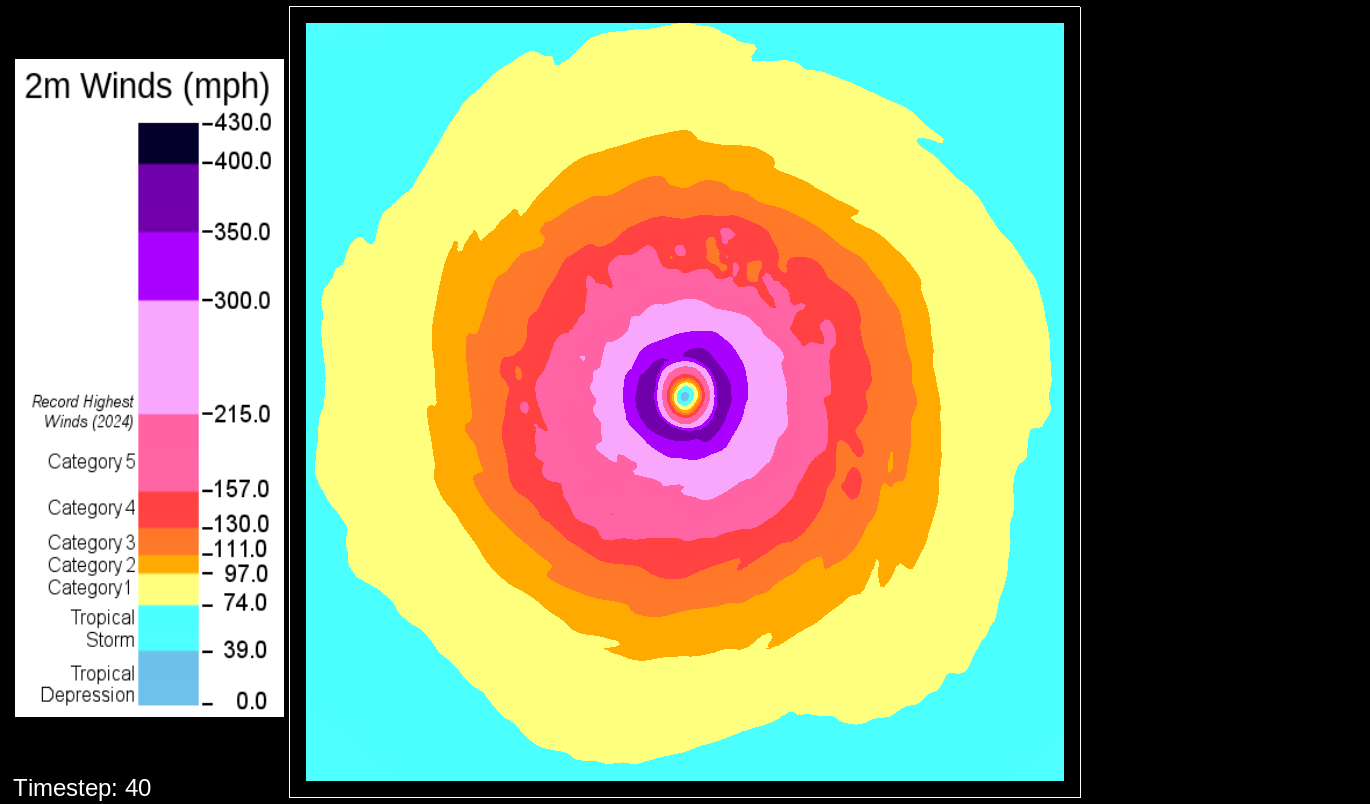 That it would be the PBL scheme makes sense, because this only happens for the U10 and V10 winds. For the U and V winds at all model levels, the winds are perfectly reasonable for increasingly deepening pressures, including in the sub-800 hPa range, and even into the theorized hypercane pressure range (sub-700 hPa). For these images, I have therefore used the level-0 (out of 30) U and V winds to calculate surface wind speeds.