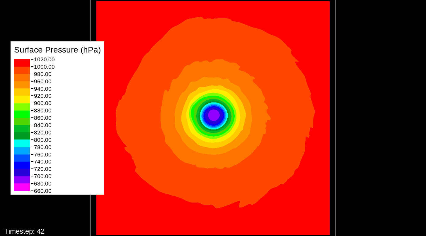 That it would be the PBL scheme makes sense, because this only happens for the U10 and V10 winds. For the U and V winds at all model levels, the winds are perfectly reasonable for increasingly deepening pressures, including in the sub-800 hPa range, and even into the theorized hypercane pressure range (sub-700 hPa). For these images, I have therefore used the level-0 (out of 30) U and V winds to calculate surface wind speeds.