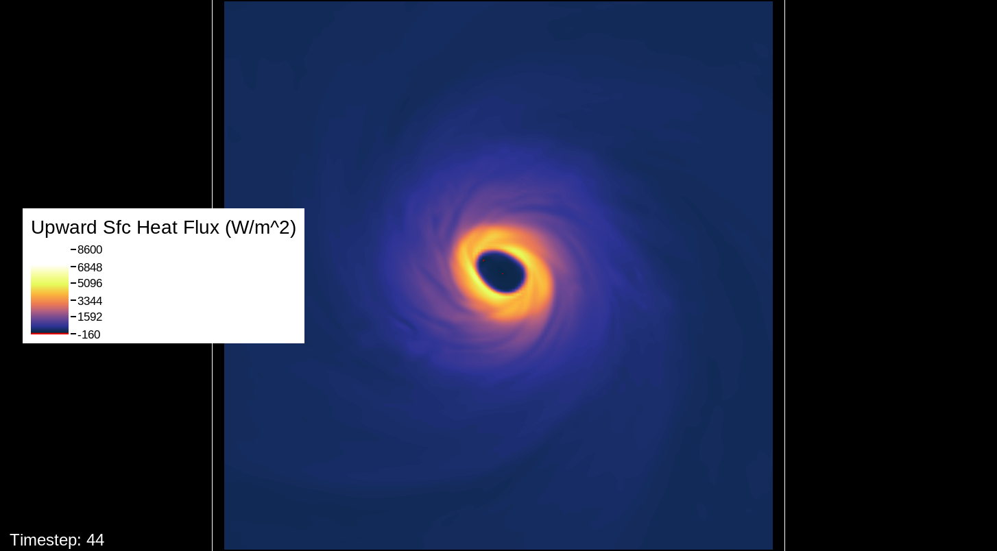 A note about the surface wind images, mostly for WRF experts and those who want to simulate the storm themselves: The images in this viewer do not represent the speed computation of the U10 and V10 speeds (the square root of the product of each of these added together). The reason for this is that the WRF’s surface wind computation is questionable for high-intensity storms. I’ve used an alternate computation that I think is more realistic for this type of system.