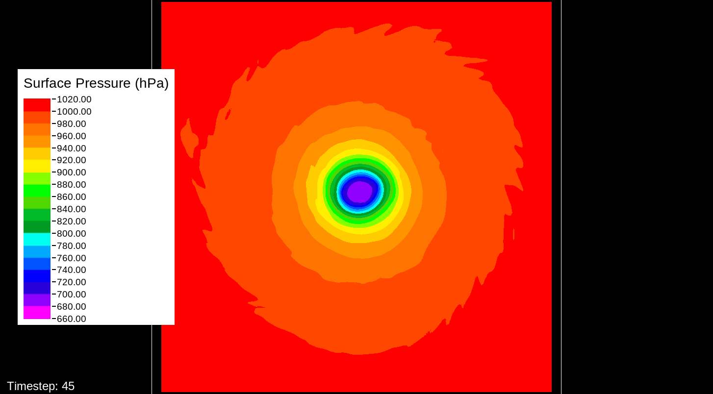 That it would be the PBL scheme makes sense, because this only happens for the U10 and V10 winds. For the U and V winds at all model levels, the winds are perfectly reasonable for increasingly deepening pressures, including in the sub-800 hPa range, and even into the theorized hypercane pressure range (sub-700 hPa). For these images, I have therefore used the level-0 (out of 30) U and V winds to calculate surface wind speeds.