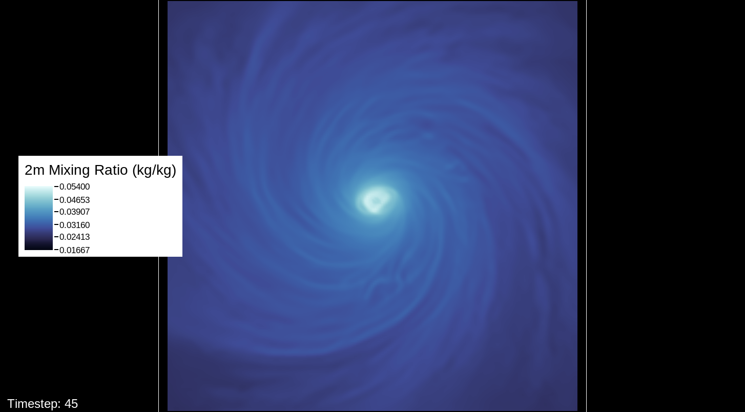 That it would be the PBL scheme makes sense, because this only happens for the U10 and V10 winds. For the U and V winds at all model levels, the winds are perfectly reasonable for increasingly deepening pressures, including in the sub-800 hPa range, and even into the theorized hypercane pressure range (sub-700 hPa). For these images, I have therefore used the level-0 (out of 30) U and V winds to calculate surface wind speeds.