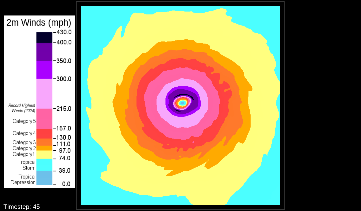 That it would be the PBL scheme makes sense, because this only happens for the U10 and V10 winds. For the U and V winds at all model levels, the winds are perfectly reasonable for increasingly deepening pressures, including in the sub-800 hPa range, and even into the theorized hypercane pressure range (sub-700 hPa). For these images, I have therefore used the level-0 (out of 30) U and V winds to calculate surface wind speeds.